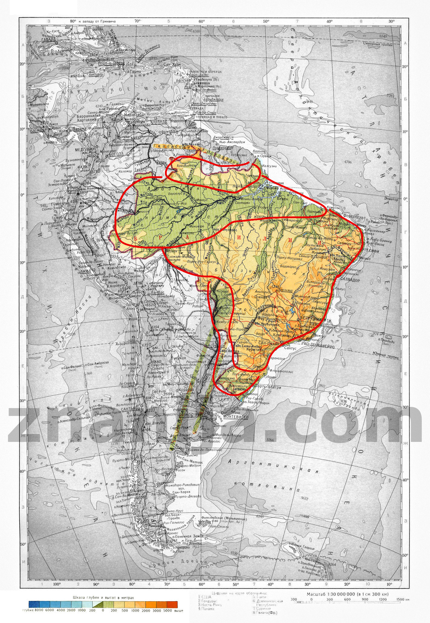 Особенностями рельефа Бразилии является наличие Бразильского плоскогорья, которое занимает основную часть страны. На севере страны - Амазонская низменность и отроги Гвианского плоскогорья. На юге - часть Ла-Платской низменности, по которой протекают реки Парагвай и Парана.