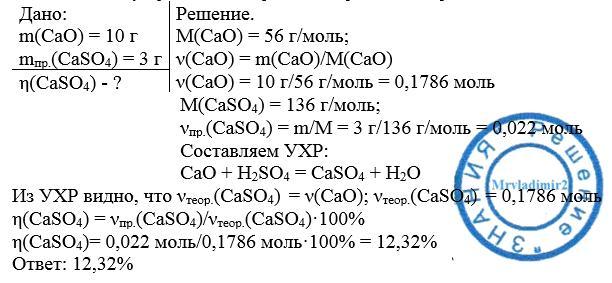 решите задачу. При взаимодействии 10г оксида кальция с серной кислотой образовался сульфат кальция массой 3г. Вычислите выход сульфата кальция в процентах по сравнению с теоретическим.