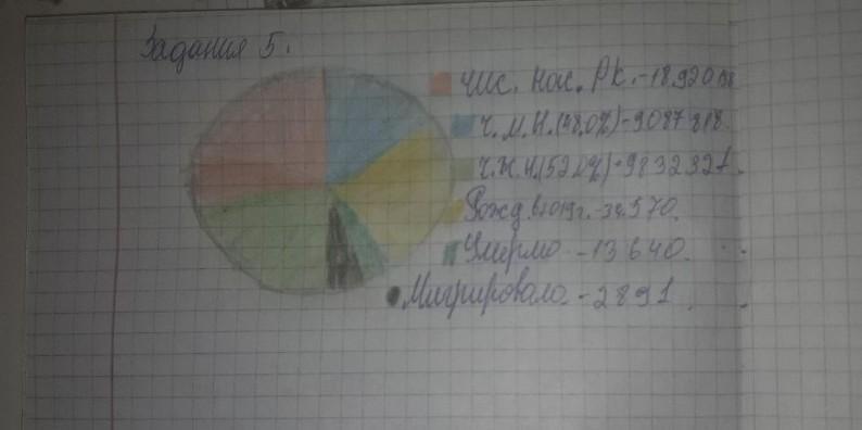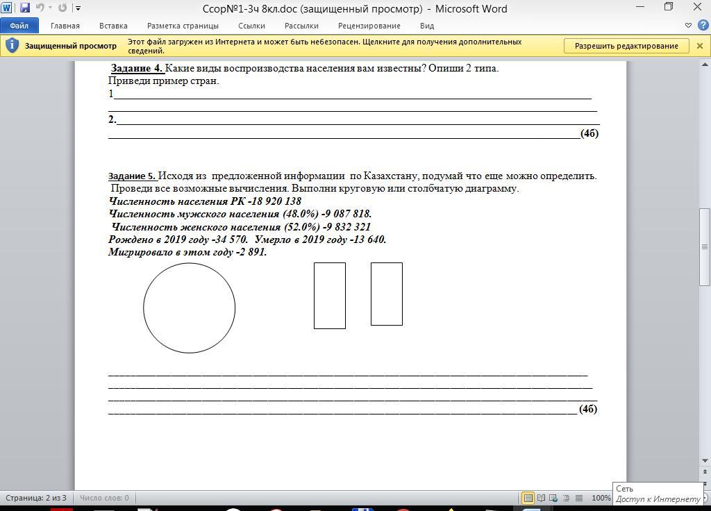 ПОМОГИТЕ ПОЖАЛУЙСТА С СОРОМ! Задание 5. Исходя из предложенной информации по Казахстану, подумай что еще можно определить. Проведи все возможные вычисления. Выполни круговую или столбчатую диаграмму. Численность населения РК -18 920 138 Численность мужского населения (48.0%) -9 087 818. Численность женского населения (52.0%) -9 832 321 Рождено в 2019 году -34 570. Умерло в 2019 году -13 640. Мигрировало в этом году -