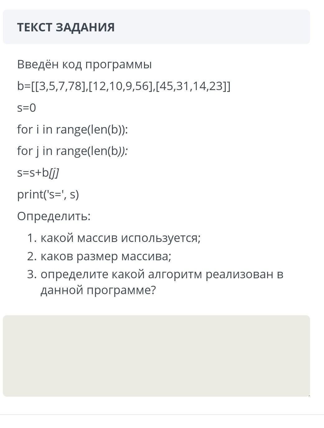 Введён код программы b=[[3,5,7,78],[12,10,9,56],[45,31,14,23]]