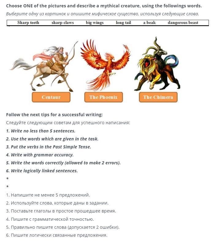 Ответ:Phoenix is a fire bird.It has a beak and flming feathers.Also it is a very dangerous creature.It can burn you!It has big wings and sharp claws.I would like to see a phoenix