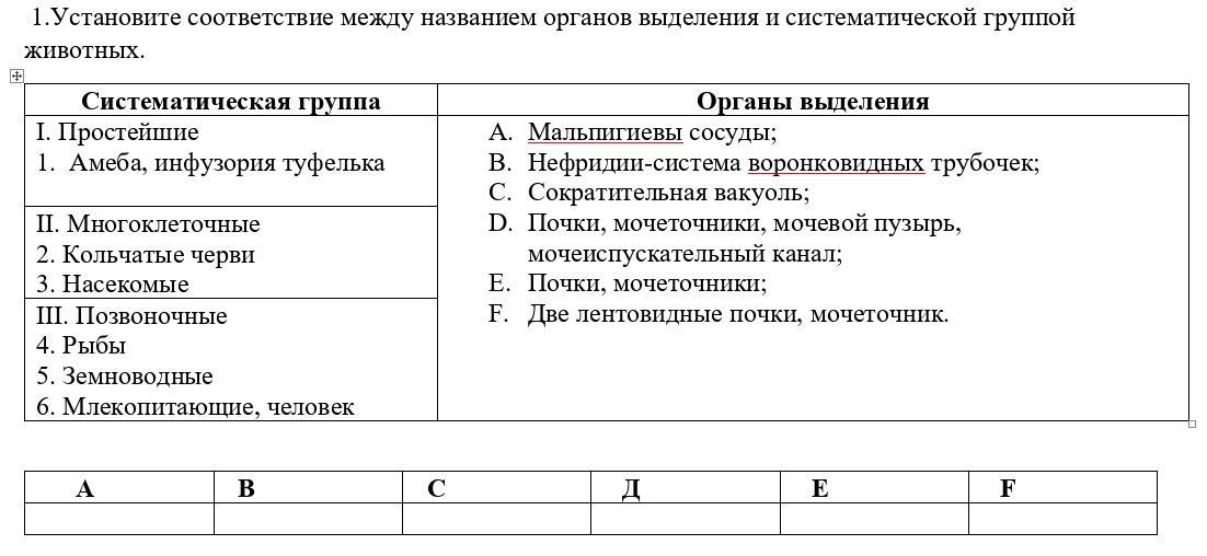 Установите соответствие между названием органов выделения и систематической группой животных. Даю 50 баллов