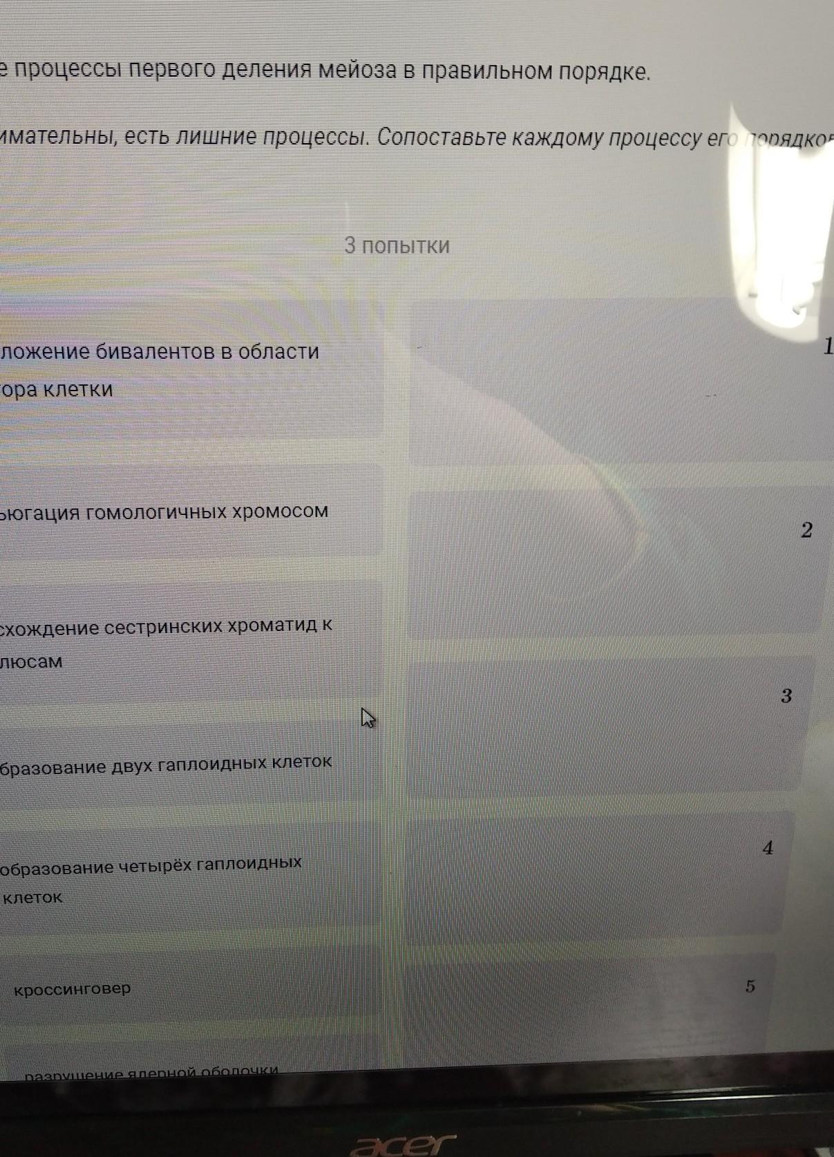 Расставьте процессы первого деления мейоза в правильном порядке.Будьте внимательны, есть лишние процессы.