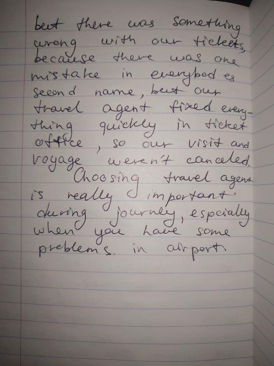 Task 2. Write about the most exciting experience of travelling that you had. Use these words: journey, check-in, travel agent, destination, hostel, rent a car, luggage, voyage, visit, ticket office.