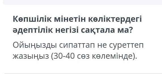 Менің ойымша қазіргі кезде қоғамдық орындарда жастар үлкендерге құрмет корсетип орын береді немесе жаяу жүргінші жолдарды жолдан ата, апаларга көмектеседі. Алайда ата-анасының айтқанын тыңдамай бұл заттарды керісінше істейтін балдарда бар. Оларға тәрбие туралы көп үйрету керек.