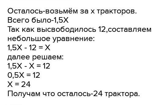 Рациональное использование техники в колхозе позволило высвободить 12 тракторов. Сколько тракторов осталось в колхозе, если известно, что было в 1,5 раза больше?