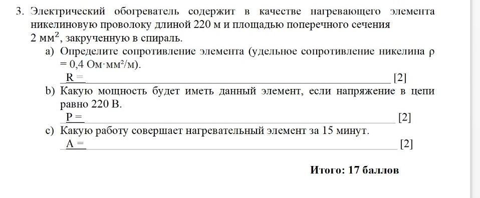 3. Электрический обогреватель содержит в качестве нагревающего элемента никелиновую проволоку длиной 220 м и площадью поперечного сечения 2мм², закрученную в спираль