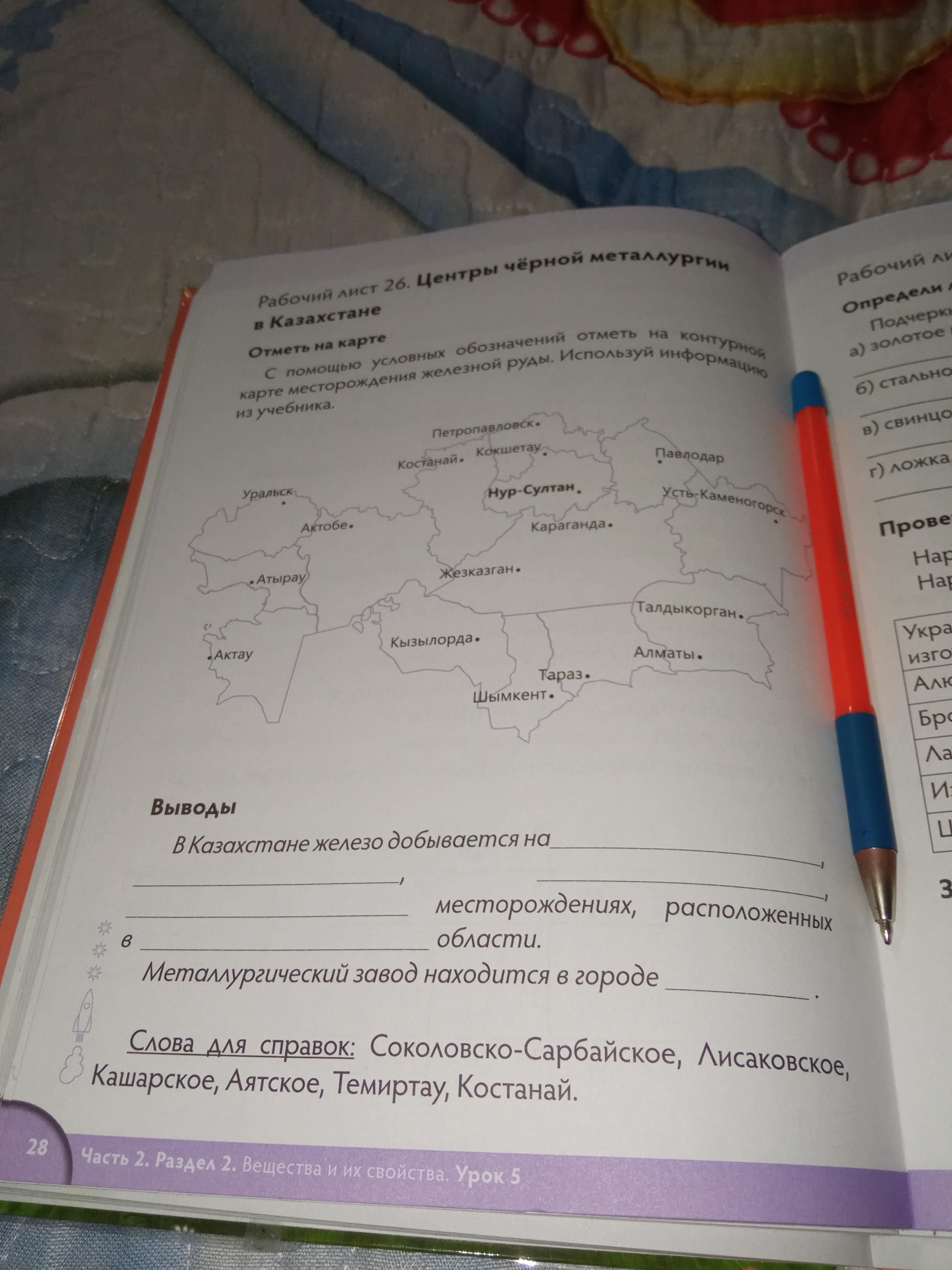 Ответ:В Казахстане железо добывают на Соколовско-Сарбайское, Лисаковское, Каширское, Вятское месторождениях, расположенных в области Костонай.