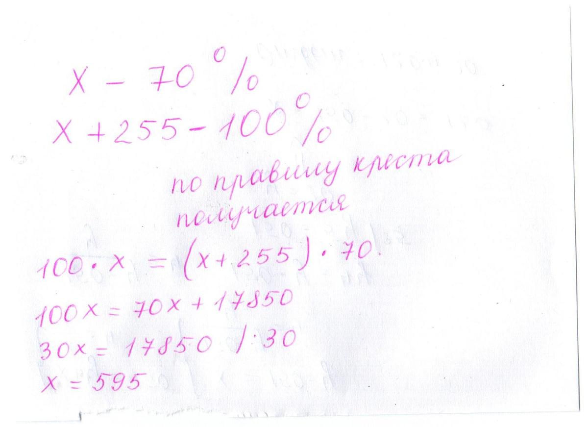 все расстояние мы возьмем за 100%. получается 70% - он прошел, а 30% ему только осталось. нам известно, что осталось ему пройти 255 км. из этого делаем вывод, что 30%-255 км. пройденное( неизвестное нам расстояние) мы возьмем за Х. все расстояние равно х+255- 100 %. отсюда составим пропорцию : она будет на фото