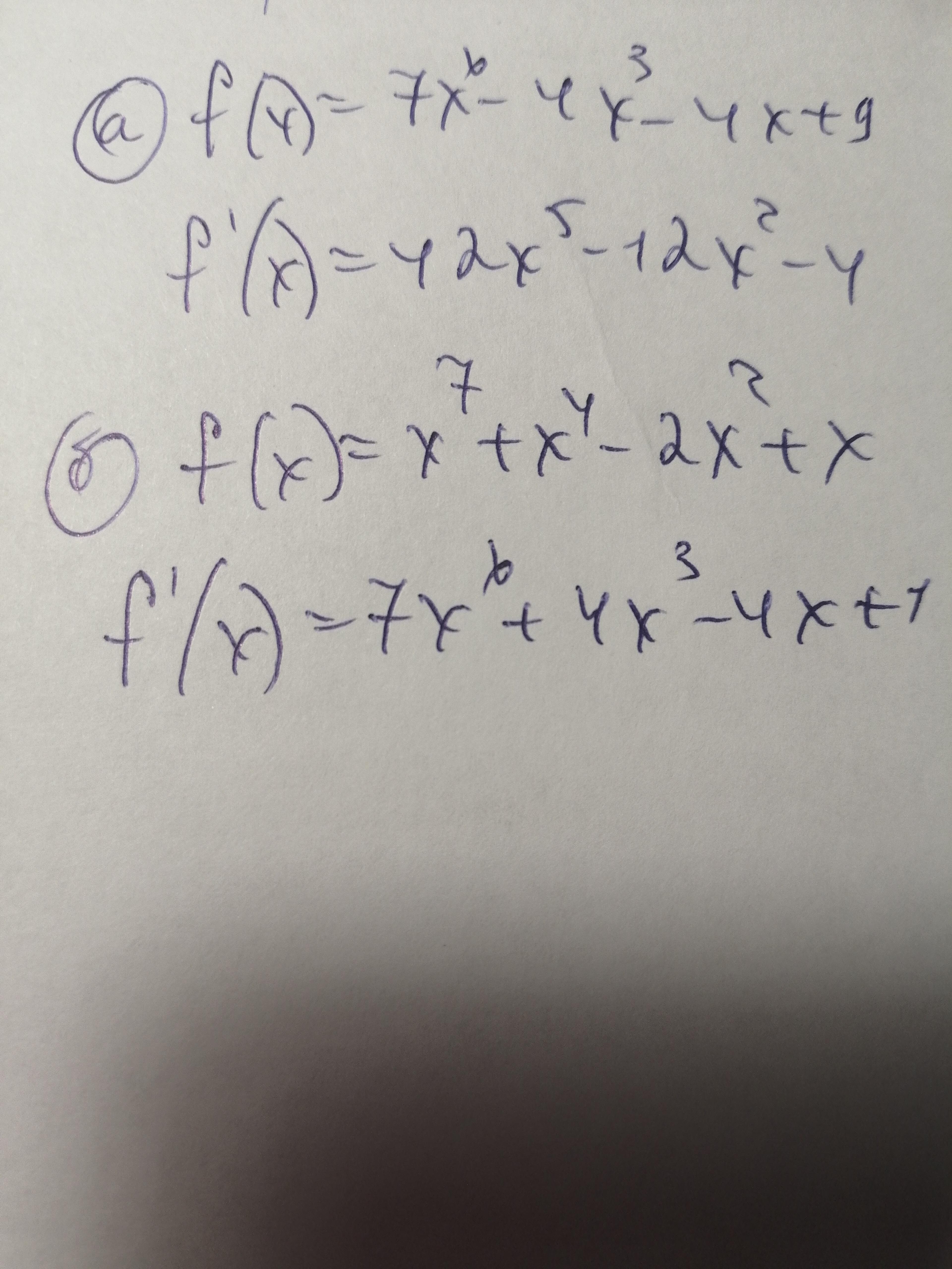 (x7+x4-2·x2+x)' = (x)' + (x4)' + (x7)' + (-2·x2)' = 1 + 4·x3 + 7·x6 + (-4·x) = 7·x6+4·x3-4·x+1