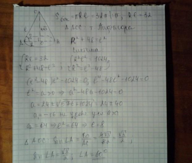 Площадь боковой поверхности конуса равна 32п см2 , А его высота - 4✓3 см. Найдите угол наклона образующей конуса к плоскости его основания.