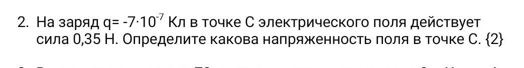 На заряд q= -7·10-⁷ Кл в точке С электрического поля действует сила 0,35 Н. Определите какова напряженность поля в точке С.
