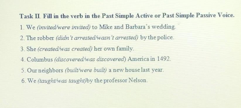 Task II Fill in the verb in the Past Simple Active or Past Simple Passive Voice.