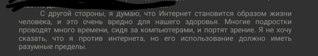 - Ответ:с другой (~) стороны, ж думаю(~) что Интернет становится(~) обризом жизни человека, и это чень ноедно(×) для Нашего(×) здоравья Многие(×) подростки проводят(~) много времени сидя(~) за компьютерами, и портят(~) зрение. Я не хону сказать, что и против интернета. на его нспользование(~) лолжно иметь разумные(×) пределы.