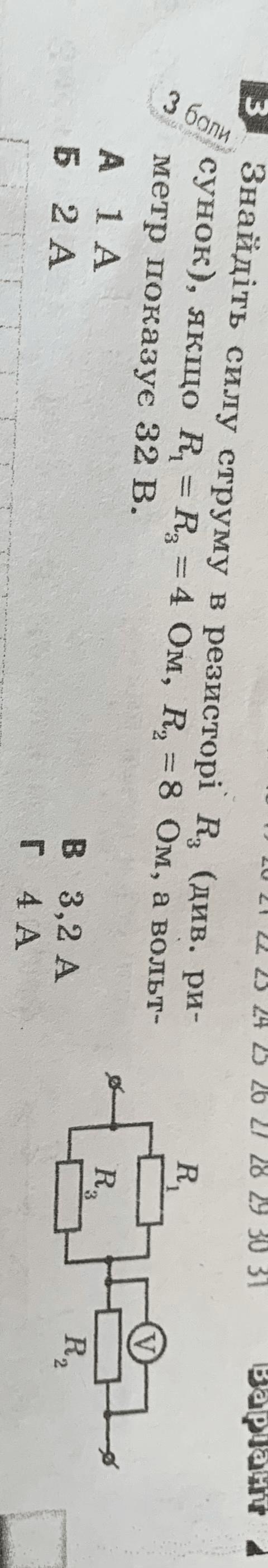 Знайдіть силу струму в резисторі R3 (див. рисунок), якщо R1=R3=4 Oм, R2=8 Ом, а вольтметр показує 32 В.
