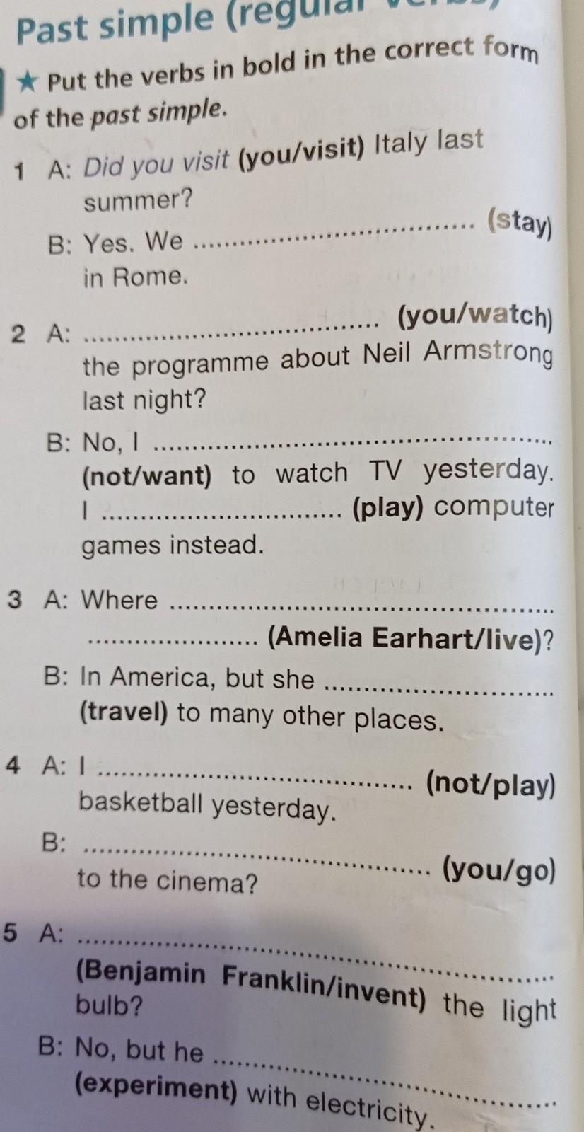 1. Yes. We stayed in Rome. 2. Did you watch the programme about Neil Armstrong last night? No, I didnt want to watch TV yesterday. I played compter games instead. 3. Where did Amelia Earthart live? In America, but she treveled to many other places. 4. I didnt play basketball yesterday. Did you go to the cinema? 5. Did Benjamin Franklin invent the light bulb? No, but he experimented with electricity