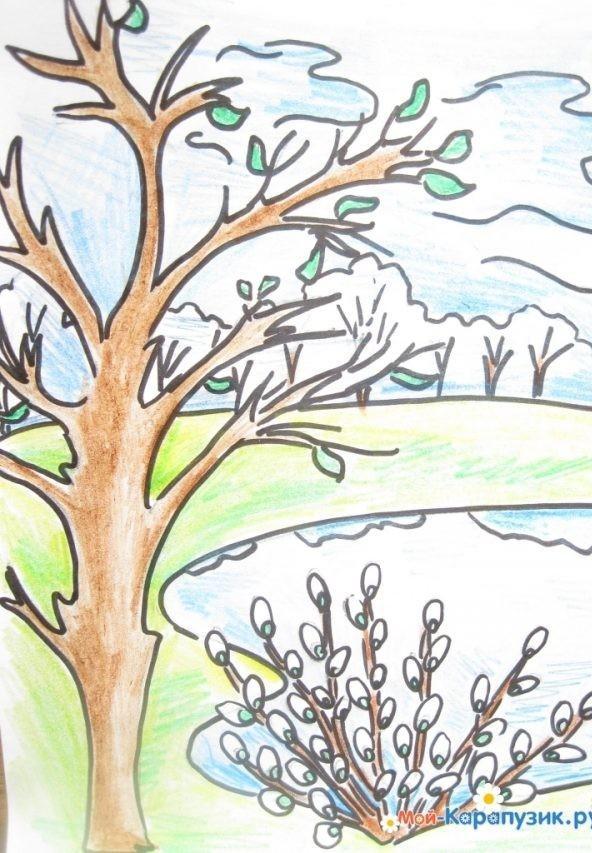 Этот пейзаж нарисован очень легко и красиво. Мы видим, изображение : деревца, кустарника и маленькой речки.