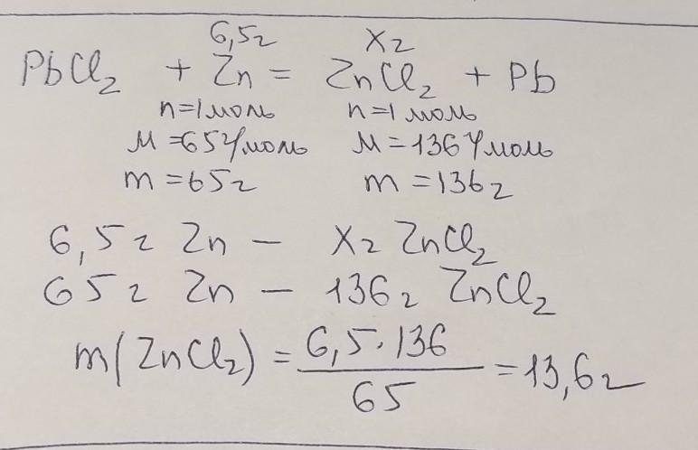 в реакцию с хлоридом свинца (2) вступил цинк массой 6,5г. Сколько граммов хлорида цинка образовалось при этом?