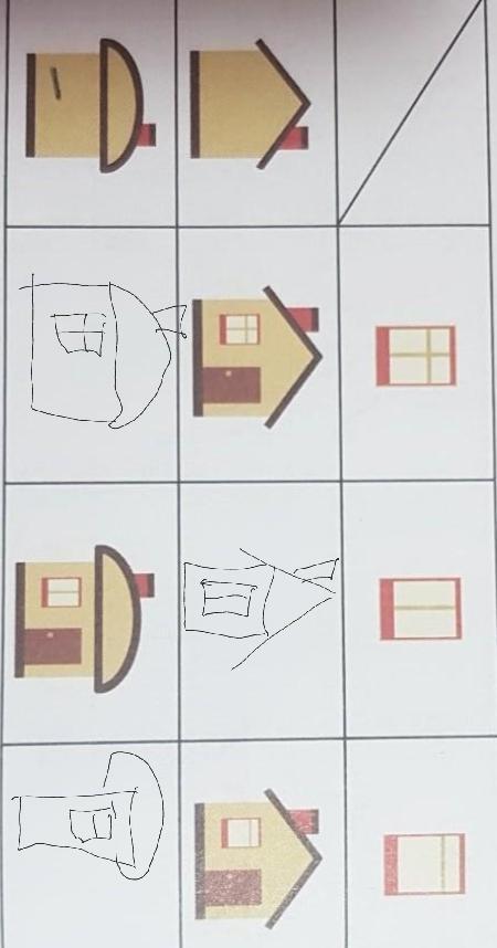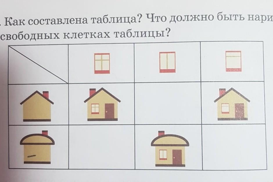 В 1 окне дом с круглой крышей и окном с + во 2 окне дом с ^ крышей и двойным окном а в 3 окне дом с круглой крышей и окном двойным по горизонтали