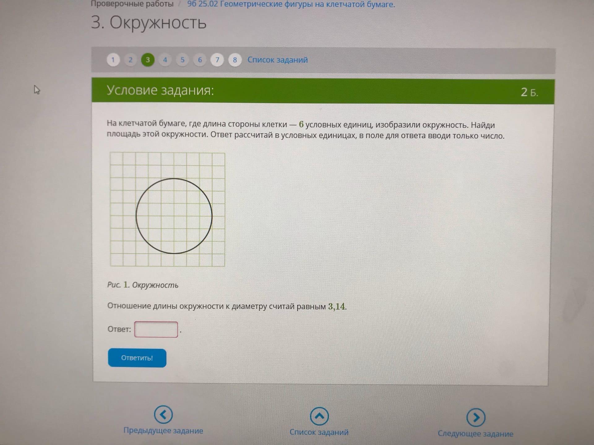 На клетчатой бумаге, где длина стороны клетки — 6 условных единиц, изобразили окружность. Найди площадь этой окружности. Ответ рассчитай в условных единицах, в поле для ответа вводи только число.