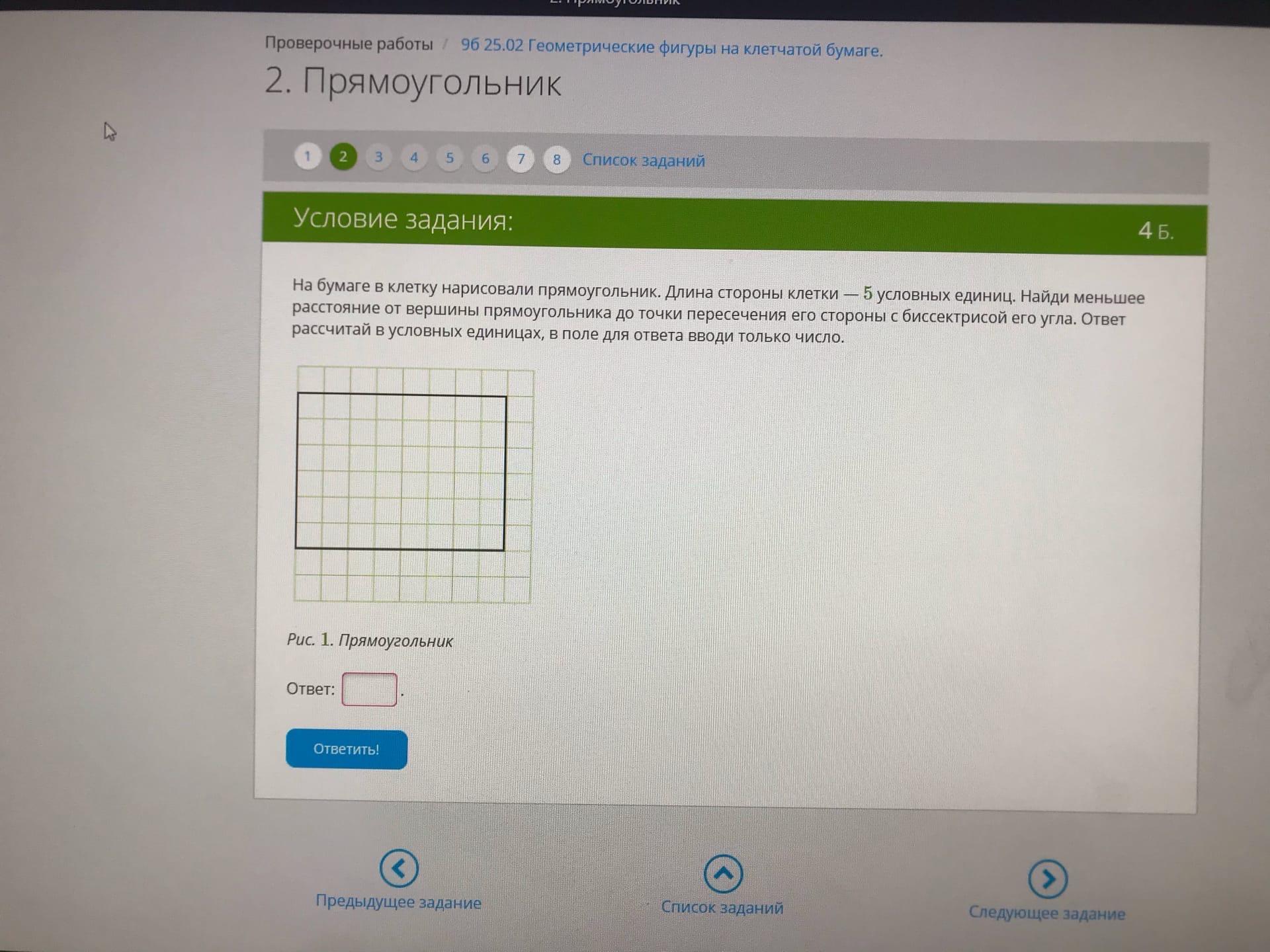 На бумаге в клетку нарисовали прямоугольник. Длина стороны клетки — 5 условных единиц. Найди меньшее расстояние от вершины прямоугольника до точки пересечения его стороны с биссектрисой его угла. Ответ рассчитай в условных единицах, в поле для ответа вводи только число.