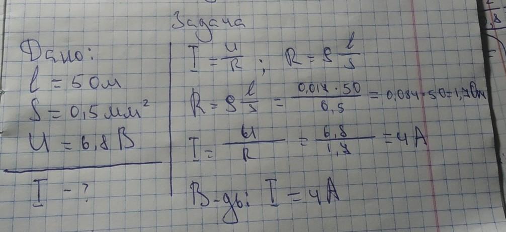 визначте силу струму, що проходить по мідному проводу довжиною 50 м і площею поперечного перерізу 0,5 мм2 при напрузі 6,8 в.