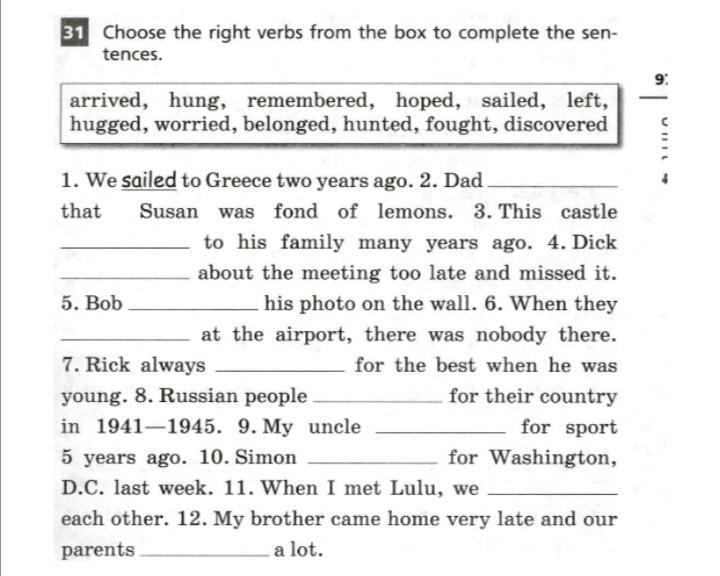Ответ: Discovered, BELONGED, REMEMBERED, HUNG, ARRIVED, HOPED, FOUGHT, HUNTED, LEFT, HUGGED, WORRIED.
