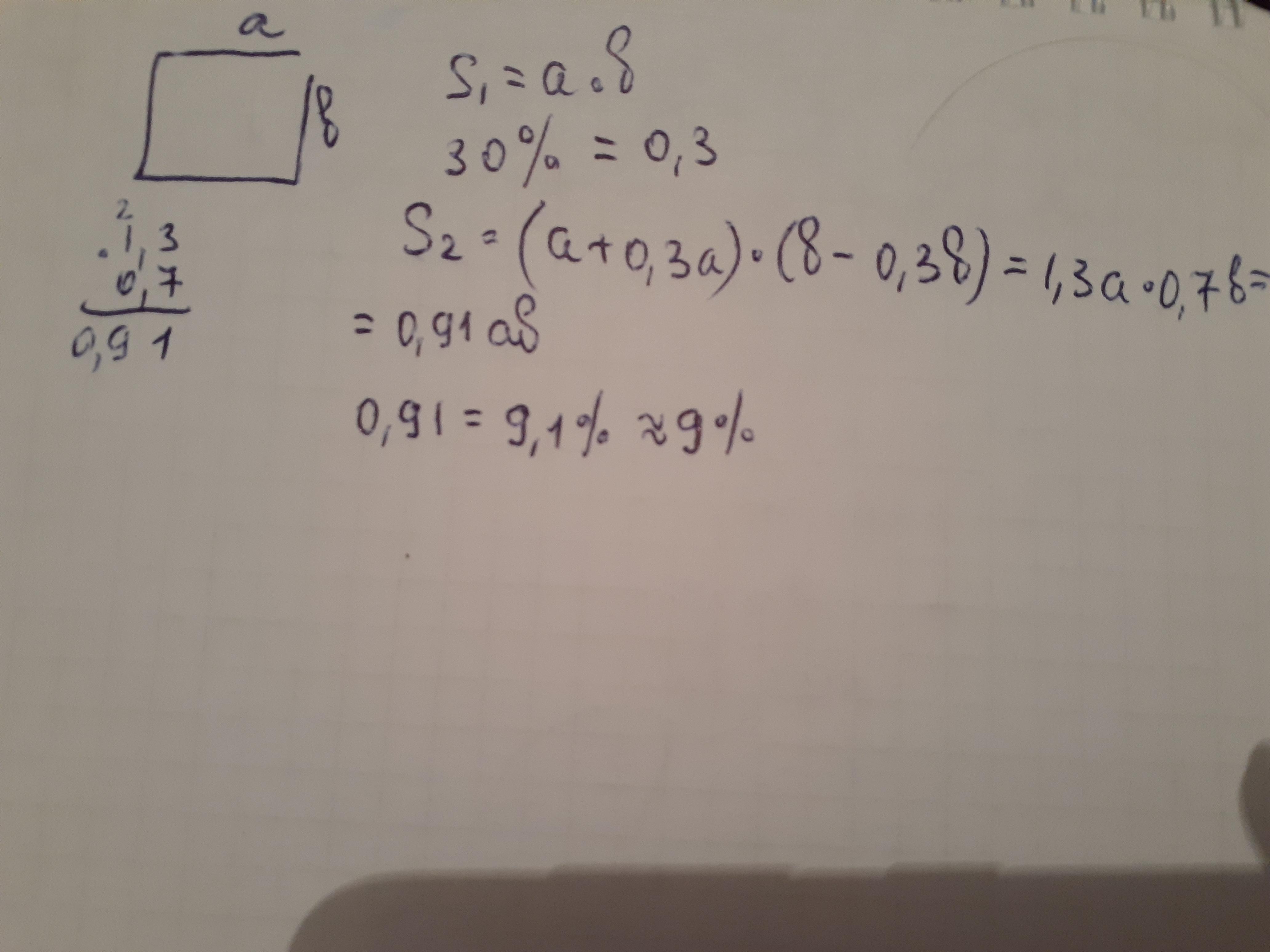 выразите изменение площади прямоугольника в процентах, если его длина увеличится на 30%, а ширина уменьшится на 30%. Можете сказать решение, пж...