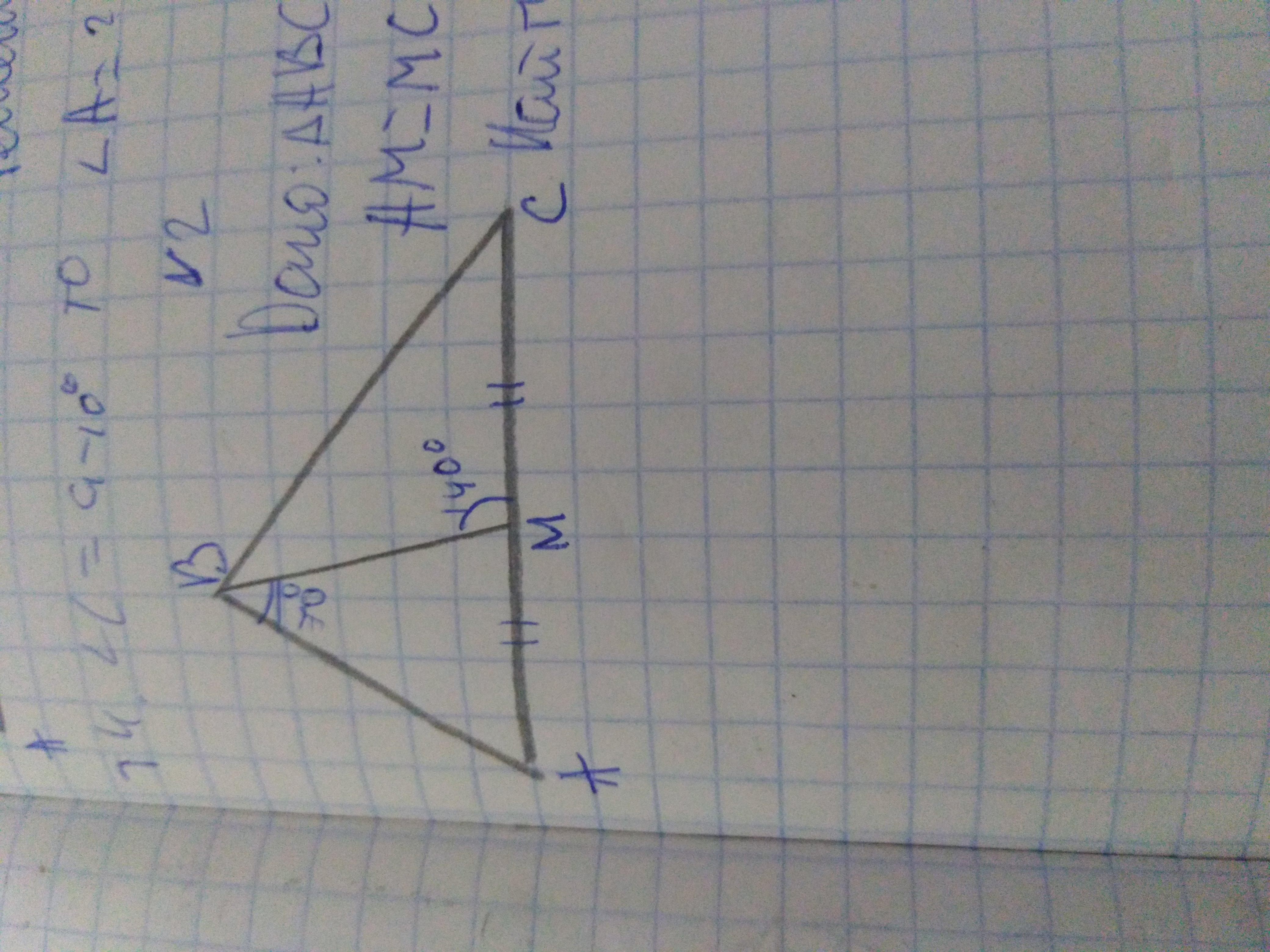 В треугольнике АВС угол АВМ равен 70°, угол ВМС равен 140°, АМ=МС. найти угол А, С и В