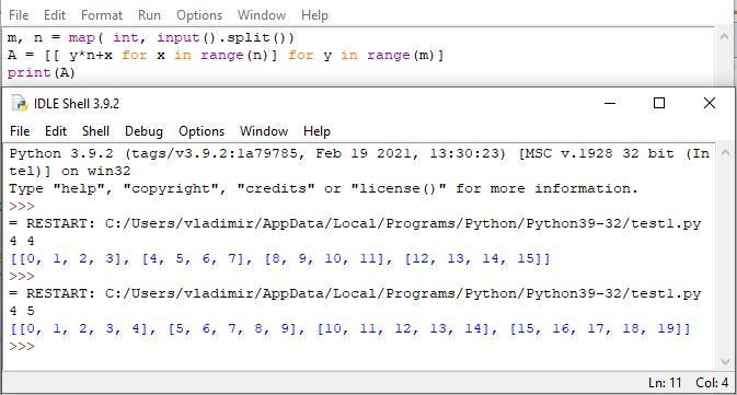 A = [[ y*n+x for x in range(n)] for y in range(m)]