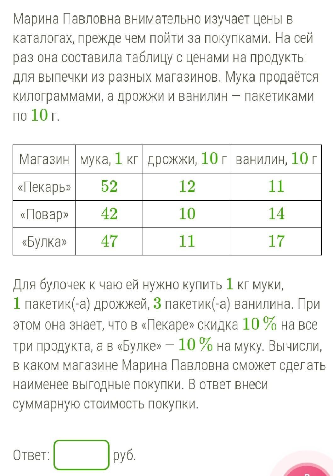 42,3+11+17*3=104.3 стоимость продуктов с учетом скидки на муку