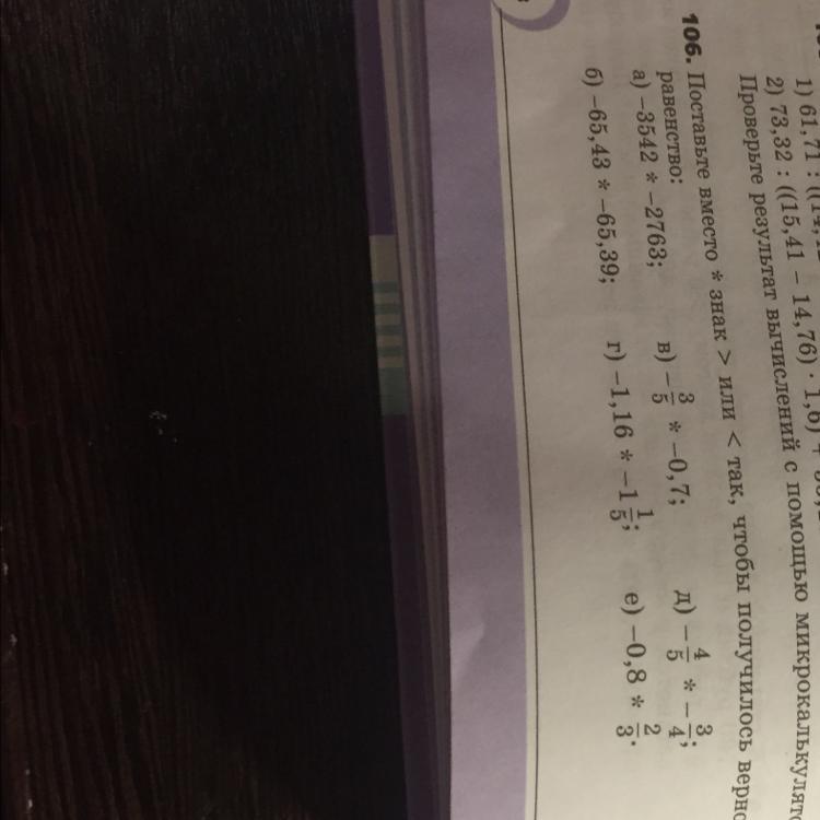 в) переведи в десятичную дробь -⅗ (3•2 и 5• 2 до десяти, это будет 0,6) -0,6 будет ближе к нулю, поэтому знак >