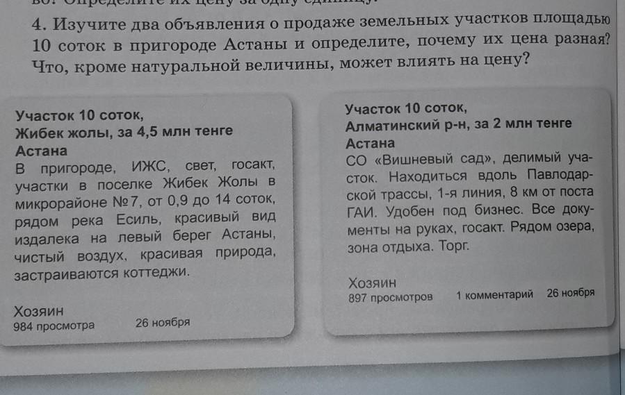 изучите два объявления о продаже земельных участков площадью 10 соток в пригороде Астаны и определите, почему их цена разная. Что, кроме натуральной велечины, может влиять на цену?