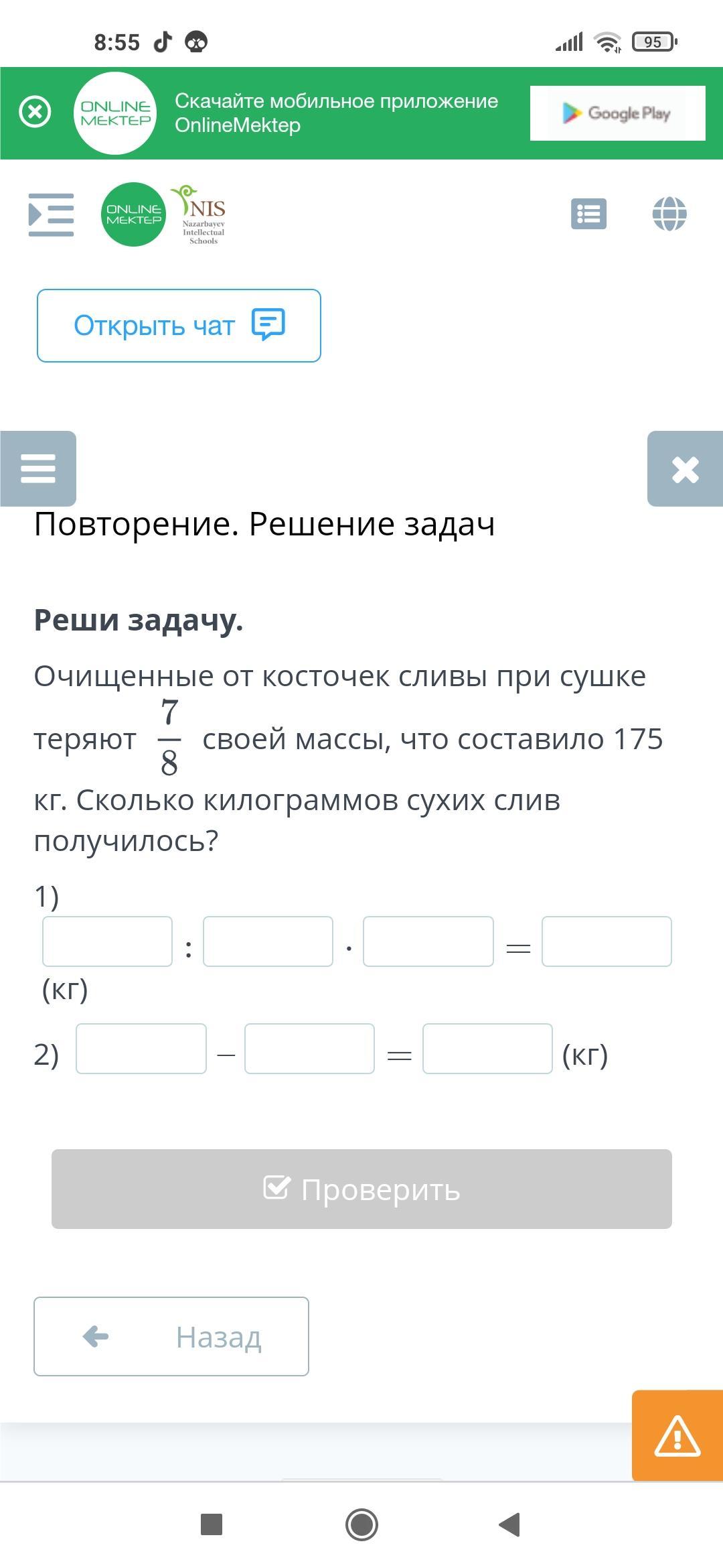Реши задачу. Очищенные от косточек сливы при сушке теряют 7/8 своей массы, что составило 175 кг. Сколько килограммов сухих слив получилось?