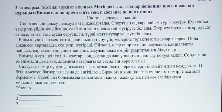 2-тапсырма. Мәтінді мұқият оқыңыз. Мәтіндегі азат жолдар бойынша шағын жоспар