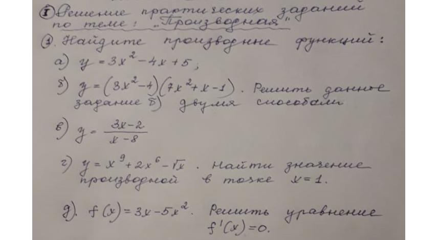 c)\ \ y=\dfrac{3x-2}{x-8}\\\\y'=\dfrac{3(x-8)-(3x-2)\cdot 1}{(x-8)^2}=\dfrac{-22}{(x-8)^2}\\\\\\d)\ \ y=x^9+2x^6-\sqrt{x}\ \ ,\ \ \ y'=9x^8+12x^5-\dfrac{1}{2\sqrt{x}}\\\\y'(1)=9+12-\dfrac{1}{2}=20\dfrac{1}{2}\\\\\\e)\ \ f(x)=3x-5x^2\ \ ,\ \ \ f'(x)=3-10x\\\\3-10x=0\ \ ,\ \ 10x=3\ \ ,\ \ x=0,3