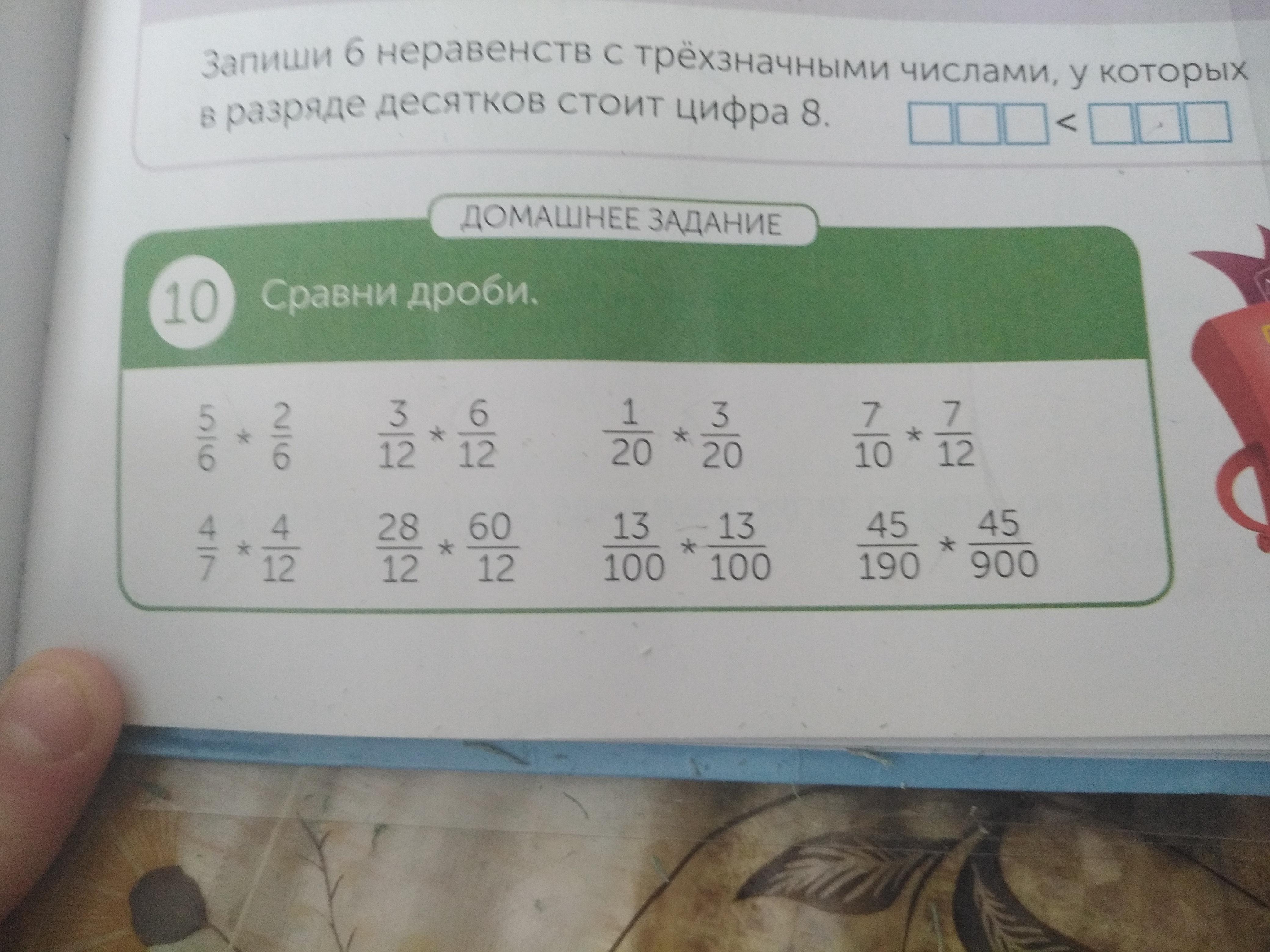 5/6>2/6, 3/12<6/12, 1/20<3/20, 7/10>7/12, 4/7>4/12, 28/12<60/12, 13/100=13/100, 45/190>45/900