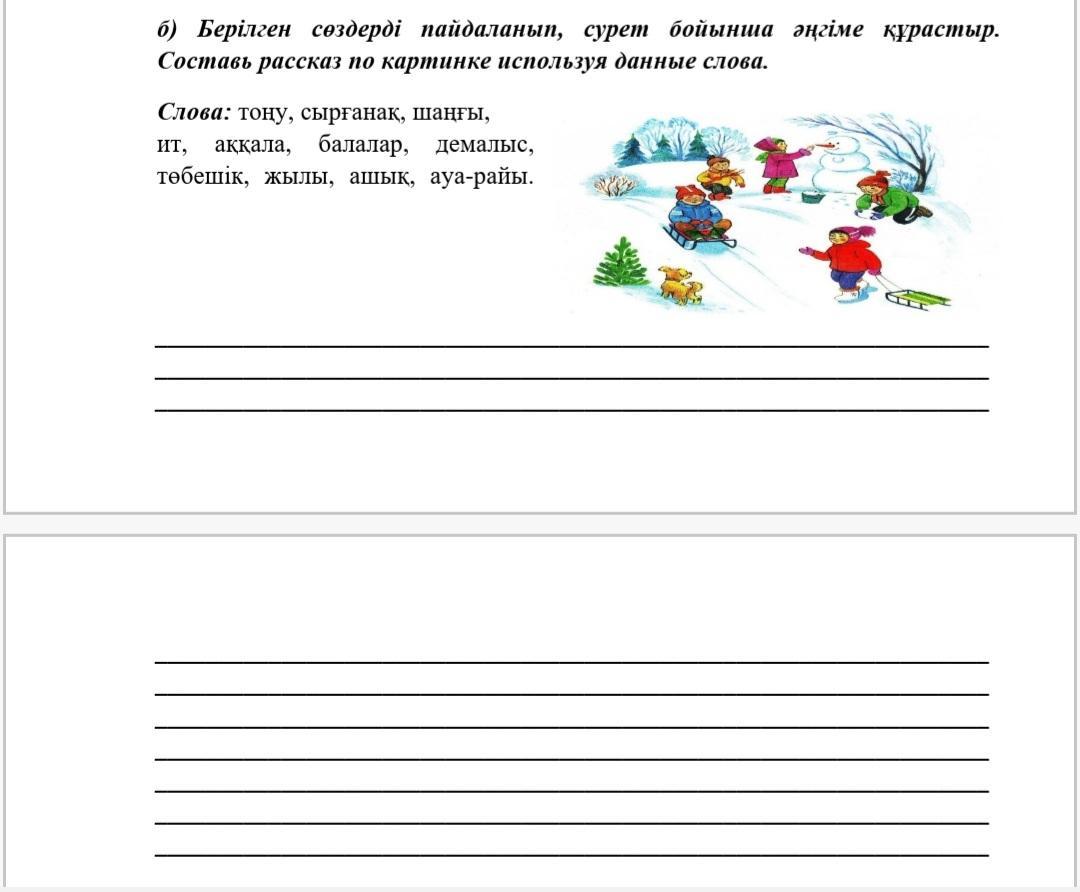 Аня горка дан төмен домалады. Мен бүгін достарыммен уақыт өткіздім, олар өздерімен шананы алып кетті.