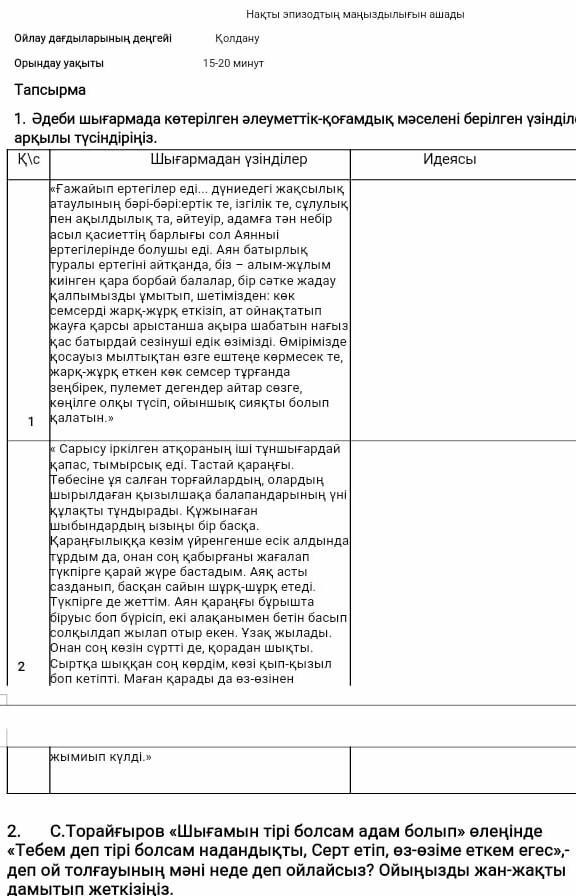 1. Әдеби шығармада көтерілген әлеуметтік-қоғамдық, мәселені берілген үзінділер