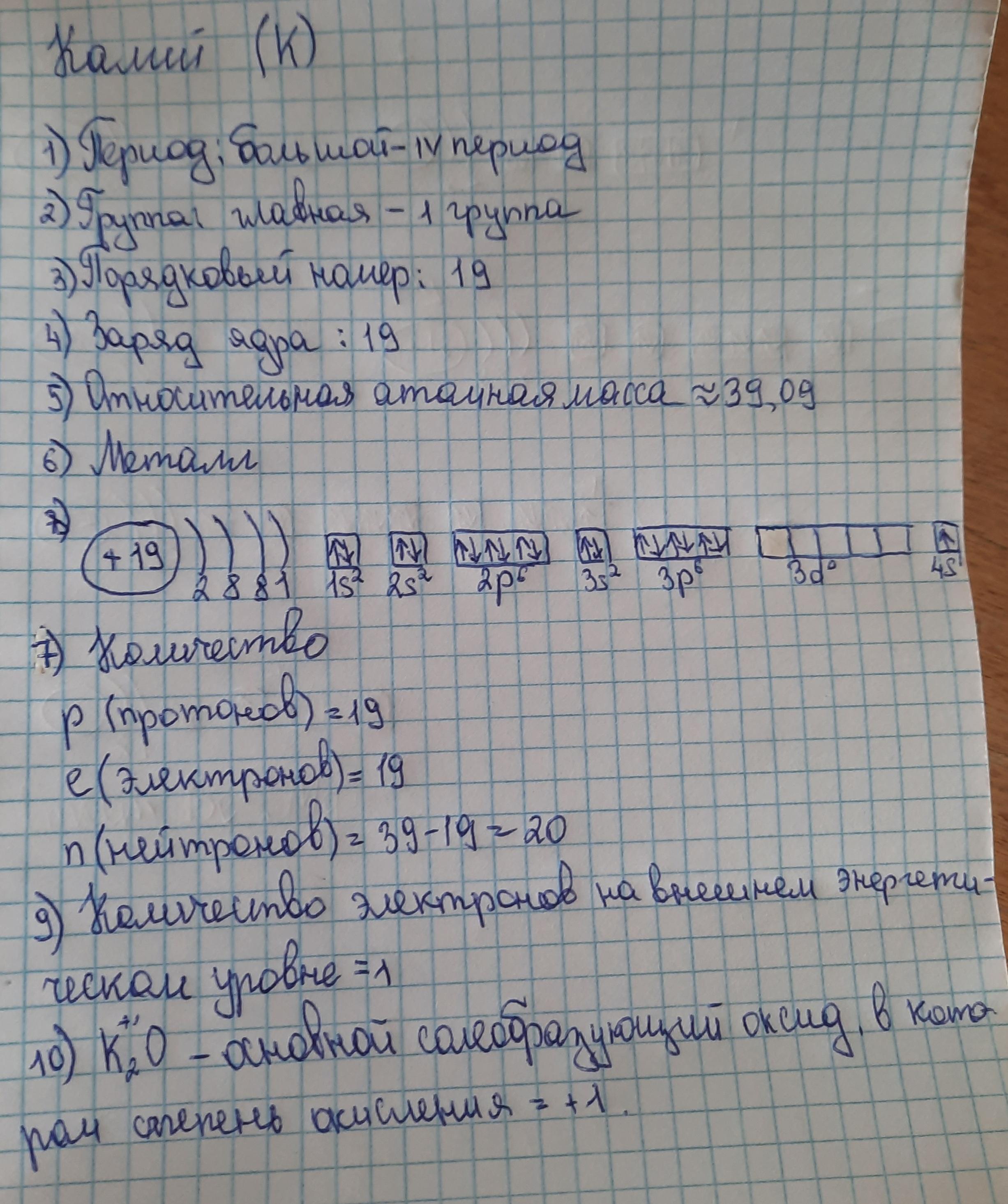 Дайте характеристику химическому элементу калию (К) по положению в периодической