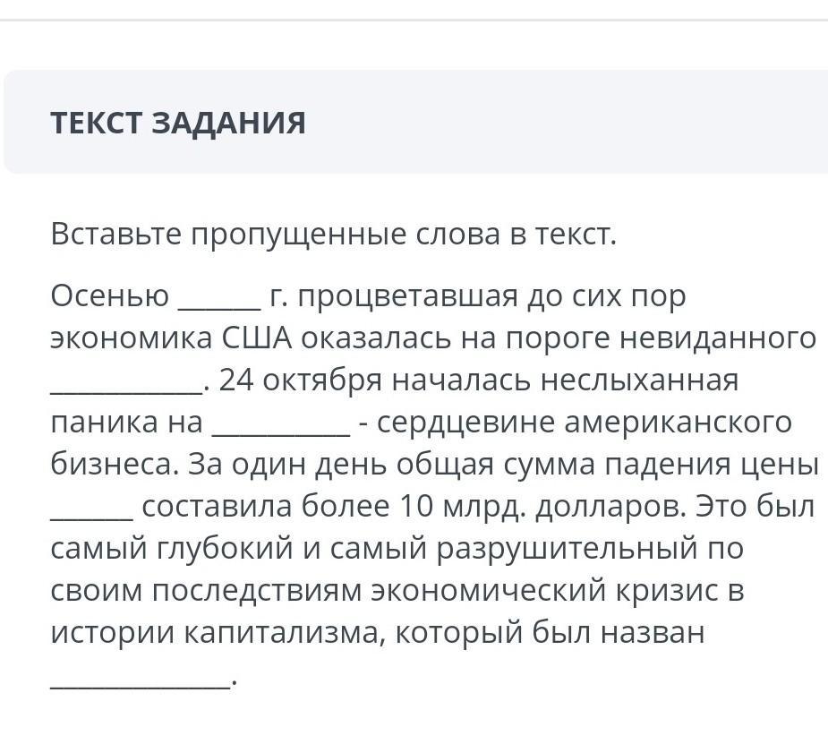 вставь пропущенные слова в тексте. Осенью___ процветающая до сих пор экономика США оказалось на пороге невиданного______.