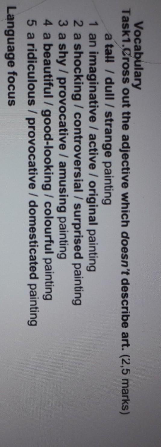 Task1.Cross out the adjective which doesn't describe art. (2,5 marks)