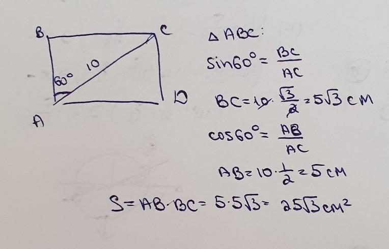 В прямоугольнике ABCD диагональ AC= 10 см, угол BAC =60°. Найти площадь прямоугольника.СРОЧНООО ПОЖАЛУЙСТААА СОР
