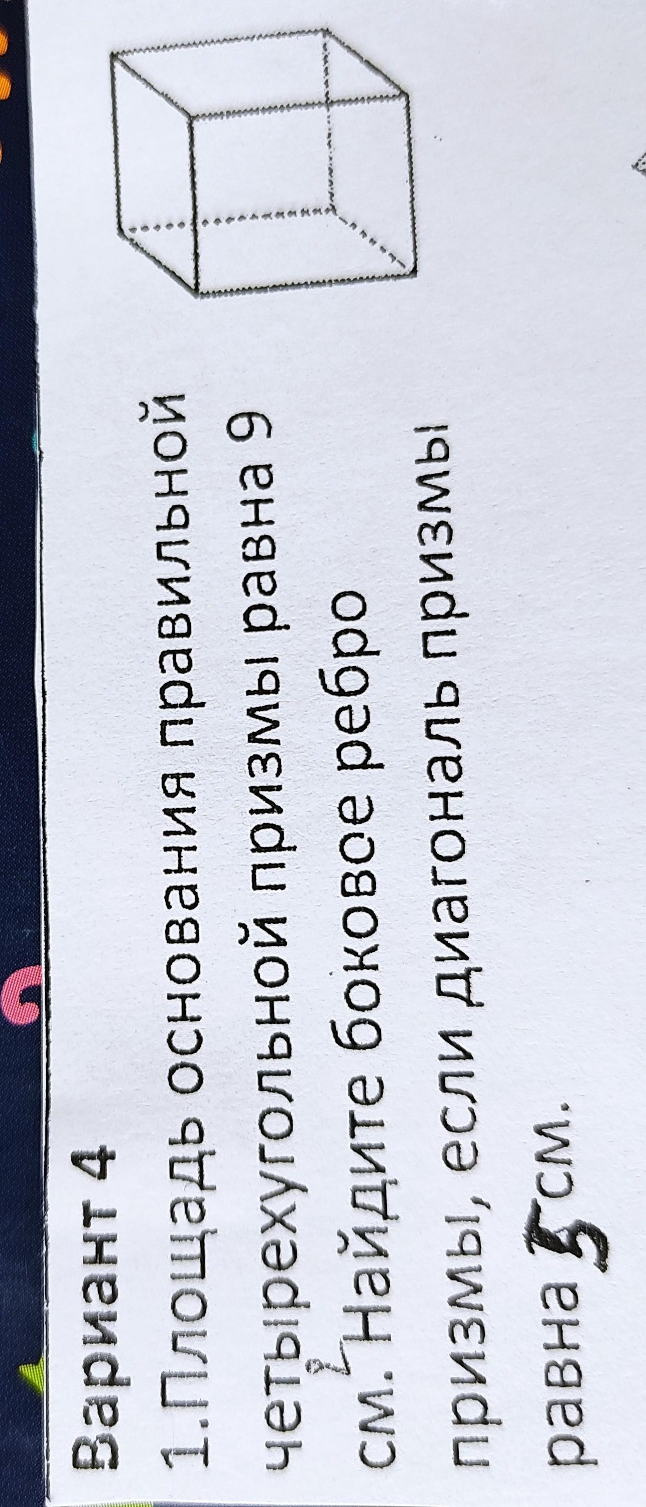 Площадь основания правильной четырехугольной призмы равна 9 см в квадрате. Найдите боковое ребро призмы, если диагональ призмы равна 5 см.