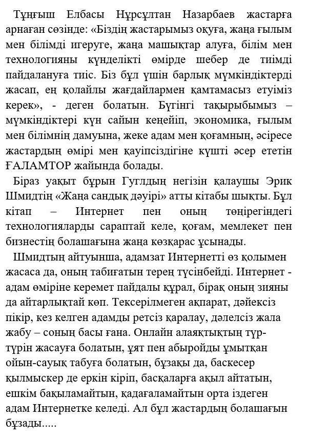 1 жас ұрпақтың білім алу үшін жана дүниелер игеру керек дейді Нұрсұлтан Назарбаев Әбішұлы