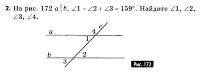 ДАЮ 20 БАЛЛОВ. ПОЖАЛУЙСТА ДО 16:00.На рисунке 173 a b, угол1 + угол2 + угол3 = 159°. Найдите угол1, угол2, угол3, угол4.