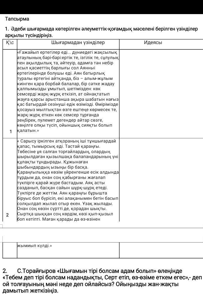 2осы үзіндіні оқысақ балалар Аянды сағынып жүргендерін байқауға болды.Оны біз осыдан түсіне аламыз”Біз,балалар,Аянды кеп уақытқа дейін еске алып ,сөз қылушы едік.”Және балалардың Аянға деген ойлары жақсы қалғанын байқауға болат .Солай оның қайтып келетініне және ол сияқты баланың аман болатынына сенеді.Және Аян хат жазамын деген сөзіне тұратынына үміттенеді .2 тапсырма Бұл жерде <<өз-өзіме еткем егес>>деп поэтикалық қолданысқа еніп,өзіме серт бердім деген мағынаны білдіреді.