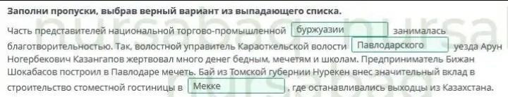 уезда Арун Ногербекович Казангапов жертвовал много денег бедным, мечетям и школам. Предприниматель Бижан Шокабасов построил в Павлодаре мечеть. Бай из Томской губернии Нурекен внес значительный вклад в строительство стоместной гостиницы в