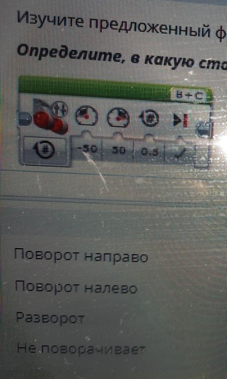 Изучите предложенный фрагмент программного кода определите в какую сторону поворачивает робот. -50 50 0.5 Поворот направо,Поворот налево,Разворот,Не поворачивает.