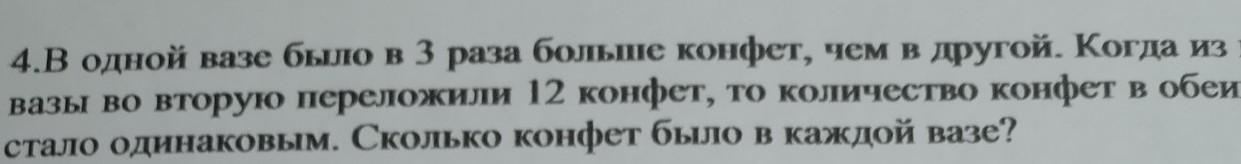 4.В одной вазе было в 3 раза больше конфет, чем в другой. Когда из первой